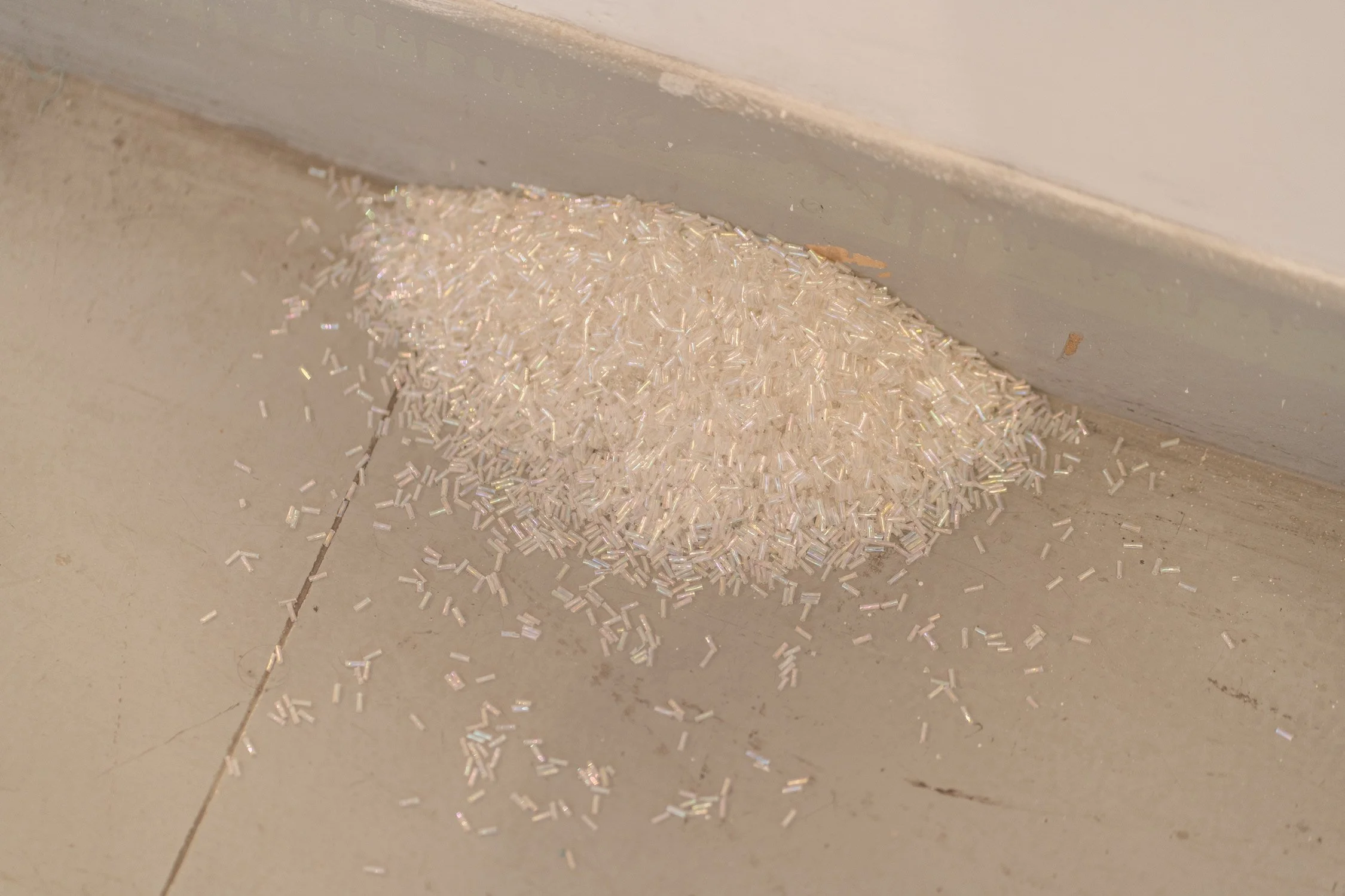 Remnants of a bitter-sweet goodbye, 2023, Found object, beads, fishing net, Dimensions Variable